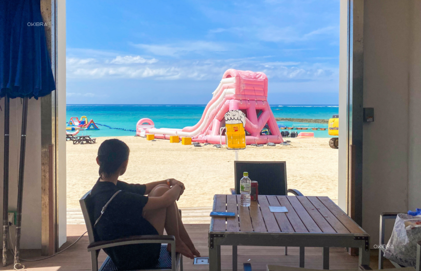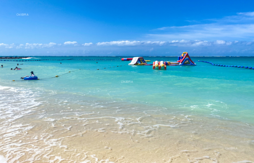 残波ビーチは遠浅で、波も穏やかなので小さな子どもが遊ぶのにぴったり。クラゲ防止ネットが設置されているため、安心して泳げます。海開きシーズン中(4〜10月)は、有料ですがアスレチックも常設。さらに、シャワーやトイレ、更衣室も完備されており、ビーチエリア内には売店もあるので、休憩や軽食にも困りません。